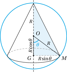 Бодолт: $O$ нь бөмбөрцгийн төв, $M$ нь конусын суурийн тойрог дээрх цэг гэе. $OM$ хэрчмийн цилиндрийн гол тэнхлэгтэй үүсгэх өнцгийг $\theta$ гэвэл суурийн радиус нь $6\sin\theta$, өндөр нь $6+6\cos\theta$ байна. Конусын эзлэхүүн нь