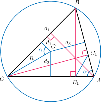 Багтаасан тойргийн төвийг $O$, өндрүүдийн суурийг $A_1,B_1,C_1$, багтаасан тойргийн төвөөс талууд хүртэлх зайг $d_1,d_2,d_3$ гэе. $AB_1=AB\cos\alpha$, $AC_1=AC\cos\alpha$ ба $A$ орой дахь өнцөг ерөнхий тул $\triangle ABC\sim\triangle AB_1C_1$ байна. Иймд $B_1C_1=BC\cos\alpha$. Үүнтэй төстэйгээр $A_1B_1=AB\cos\gamma$, $A_1C_1=AC\cos\beta$. Мөн $\angle BOC=2\alpha$ тул $d_1=R\cos\alpha$ болно. Мөн адил шалтгаанаар $d_2=R\cos\beta$, $d_3=R\cos\gamma$.
