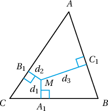 $ABC$ гурвалжны дотор орших $M$ цэгээс $BC$, $CA$, $AB$ талуудад татсан перпендикулярын сууриуд нь харгалзан $A_1$, $B_1$, $C_1$ ба $MA_1=d_1$, $MB_1=d_2$, $MC_1=d_3$ бол