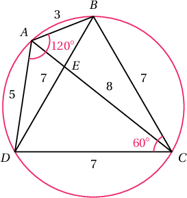 $ABCD$ дөрвөн өнцөгтийн талбай $$S=S_{ABD}+S_{BCD}=\dfrac12\cdot7\cdot7\sin60^\circ+\dfrac12\cdot3\cdot5\cdot\sin120^\circ=16\sqrt{3}$$ байна. $O$ тойргийн радуис $\dfrac{BD}{2\sin60^\circ}=\dfrac{7\sqrt3}{3}$ байна. $ABD$ гурвалжинд багтсан тойргийн радиус $$\dfrac{2S_{ABD}}{AB+BD+DA}=\dfrac{AB\cdot AD\cdot\sin120^\circ}{3+7+5}=\dfrac{\dfrac{15\sqrt3}{2}}{15}=\dfrac{\sqrt3}{2}$$ байна. $ABCD$ дөрвөн өнцөгтийн диагоналиудын огтолцолын цэг $E$ бол $S=\dfrac12 AC\cdot BD\cdot\sin\angle AEB$ буюу $16\sqrt3=\dfrac12\cdot 8\cdot 7\cdot\sin\angle AEB$. Эндээс $\sin\angle AEB=\dfrac{4\sqrt{3}}{7}$ байна.