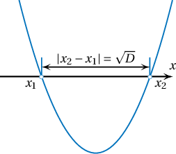 Бодолт: $$|x_2-x_1|=\Big|\dfrac{-b-\sqrt{D}}{2}-\dfrac{-b+\sqrt{D}}{2}\Big|=\sqrt{D}$$