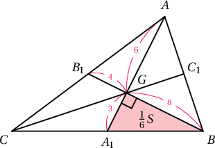 Гурвалжны медианууд гурвалжинг тэнцүү талбайтай 6 жижиг гурвалжинд хуваадаг. Мөн оройгоос $2:1$ харьцаатай хуваагддаг тул нэг нь $3,8$ талтай тэгш өнцөгт гурвалжин байна. Иймд жижиг гурвалжны талбай $\dfrac{3\cdot 8}{2}=12$, том гурвалжны талбай $6\cdot 12=72$ байна.