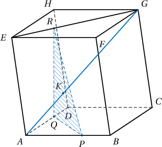 $K$ цэг $PQR$ гурвалжны хүндийн төв тул $$\overrightarrow{AK}=\dfrac{\overrightarrow{AP}+\overrightarrow{AQ}+\overrightarrow{AR}}{3}=\dfrac{1}{3}\Big(\dfrac23\overrightarrow{AB}+\dfrac{2}{3}\overrightarrow{AD}+\overrightarrow{AE}+\dfrac{\overrightarrow{AB}+\overrightarrow{AD}}{3}\Big)=$$ $$=\dfrac13(\overrightarrow{AB}+\overrightarrow{AD}+\overrightarrow{AE})=\dfrac{1}{3}\overrightarrow{AG}\Rightarrow \overrightarrow{AG}=3\overrightarrow{AK}.$$ Тул $K$ цэг $AG$-г $1:2$ харьцаагаар хуваана.