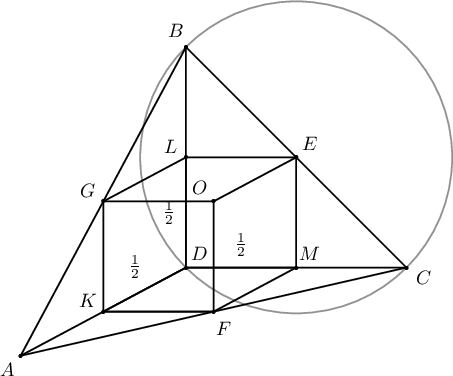 Багтаасан бөмбөрцгийн төв нь талсуудын багтаасан тойргийн төвийг дайруулан татсан уг талдаа перпендикуляр шулуунууд дээр байрлах тул зурагт үзүүлсэн $\dfrac12$ талтай кубийн орой нь багтаасан бөмбөрцгийн радиус болно. Иймд