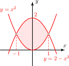 Дүрсийн талбай нь $$\int_{-1}^1[(2-x^2)-x^2]\,\mathrm{d}x=\int_{-1}^1(2-2x^2)\,\mathrm{d}x=\dfrac83.$$