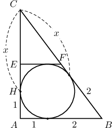 Бодолт: $CH$ шүргэгчийн уртыг $x$ гэвэл талуудын урт нь $x+1$, $1+2=3$, $x+2$ байна. Пифагорын теоремоор $$(x+1)^2+3^2=(x+2)^2\Rightarrow 2x=6\Rightarrow x=3$$ байна. Иймд гурвалжны талууд нь $AC=4$, $AB=3$, $BC=5$ байна. $AC=4$ ба $AE=2r=2\Rightarrow CE=2$. Тул $EF$ дундаж шугам болно. Иймд $AEFB$ трапецийн талбай нь $$\dfrac{AB+EF}{2}\cdot AE=\dfrac{3+1.5}{2}\cdot 2=4.5$$