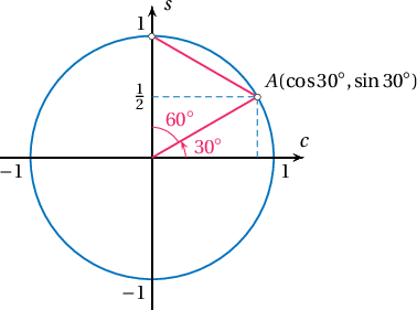 Өнцгийн тойргийг огтлох цэгийг $A$ гэе. Тэгвэл $A(\cos30^\circ,\sin30^\circ)$ болно. $(0,0)$, $(0,1)$, $A$ нь нэг зөв гурвалжны оройн цэгүүд болох тул $A=\Big(\dfrac{\sqrt3}{2},\dfrac{1}{2}\Big)$ болно. Иймд $$\sin30^\circ=\dfrac12=0.5$$ байна.