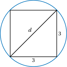 Диагоналийн урт нь $d^2=3^2+3^2$ буюу $d=\sqrt{18}=3\sqrt2$. Тойргийн уртыг диаметрт харьцуулсан харьцаа $\dfrac{\ell}{d}=\pi$ тул $\ell=3\pi\sqrt2$ байна.