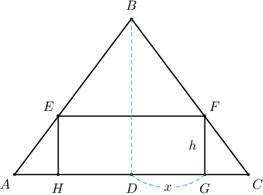 Адил хажуут гурвалжин тул уг өндрийн сууриас суурийн орой хүртэлх зай нь $DC=\dfrac{6}{2}=3$, өндөр нь $$BD=\sqrt{BC^2-DC^2}=\sqrt{5^2-3^2}=4$$ байна. Тэгш өнцөгтийн нөгөө тал нь суурьт буусан өндөртэй параллель тул төсөөтэй гурвалжны талуудын харьцаагаар $$\dfrac{GC}{DC}=\dfrac{FG}{BD}\Leftrightarrow\dfrac{3-x}{3}=\dfrac{h}{4}$$ буюу $$h=\dfrac{4}{3}(3-x)$$ байна. Тэгш өнцөгтийн талбай нь $$S(x)=2x\cdot h=\dfrac{8}{3}x(3-x)$$ болно. Энэ нь $$S^\prime(x)=8-\dfrac{16}{3}x\Rightarrow x=\dfrac32$$