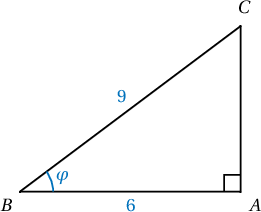 $ABC$ тэгш өнцөгт гурвалжны $\measuredangle BAC=90^\circ$, $BC=9$, $AB=6$ бол $\cos\measuredangle ABC=?$