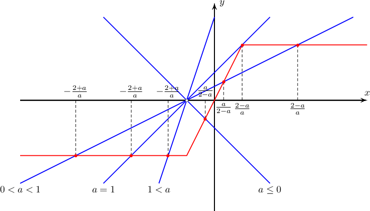 Бодолт: $f(x)=|x+1|-|x-1|$ функцийн график ба $g(x)=a(x+1)$ функцийн графикийг $a$-ийн ялгаатай утгуудад байгуулбал: