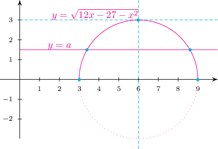 Учир $y=a$ шулуун ба $y=\sqrt{12x-27-x^2}$ функцийн графикийн огтлолцлийн цэгийн абсцисс нь $\sqrt{12x-27-x^2}=a$ тэгшитгэлийн шийд байна.