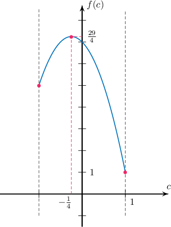 Хамгийн бага утга нь $c=1$ үед $y=f(1)=1$. Хамгийн их утга нь $c_0=-\dfrac{b}{2a}=-\dfrac14$ үед