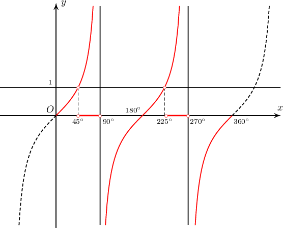 $\left\{ % \begin{array}{l} \tg x>1 \\ x\in [0^{\circ};360^{\circ}[ \\ \end{array} % \right. \Leftrightarrow x\in \Bigl]\fbox{ab}^{\circ};90^{\circ}\Bigr[\cup \Bigl]\fbox{cde}^{\circ};\fbox{fgh}^{\circ}\Bigr[$.