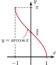 $y=\arccos x$ нь $y=\cos x$ функцийн $[0;\pi]$ муж дахь урвуу функц юм. Иймд тодорхойлогдох муж нь $[-1;1]$, утгын муж нь $[0;\pi]$ байна. Мөн арккосинус функц нь буурах функц юм.