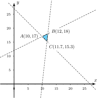 Бодолт: Бодлогын өгөгдлийг бичвэл $x+y>27$, $x>2(y-12)$, $y>9(x-10)$ байна. Тэнцэтгэл бишийн шийдийн муж нь $x+y=27$ шулуунаас дээш орших цэгүүд, $x>2(y-12)$ шулуунаас доош орших цэгүүд, $y>9(x-10)$ шулуунаас дээш орших цэгүүдийн олонлог байна.