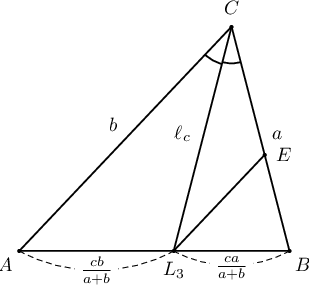 Биссектрисийн чанараас $AL_3=\dfrac{cb}{a+b}$, $L_3B=\dfrac{ca}{a+b}$ байна. Мөн $AC\parallel L_3E$ тул ӨӨ шинжээр $\triangle ABC\sim\triangle L_3BE$ тул