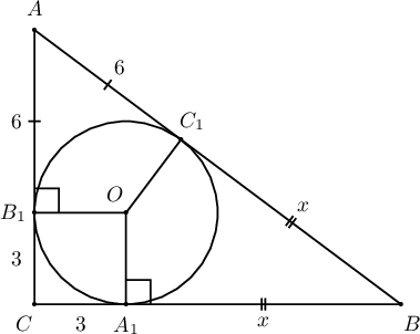 Тэгш өнцөгт гурвалжны катет $9$ нэгж, багтсан тойргийн радиус $3$ нэгж бол өндрийн сууриар гипотенузын хуваагдсан хэсгүүд хэд хэдэн нэгж вэ?