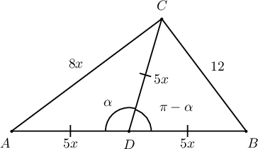 2 дахь гурвалжны суурийн уртыг $8x$ гэвэл хажуу талын урт нь $5x$ байна. Энэ гурвалжны оройн өнцгийг $\alpha$ гэвэл косинусын теоремоор