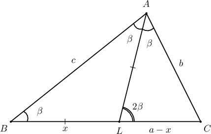 Бодолт: $\triangle ALC$-ийн $A$ орой дахь өнцөг нь $\beta$, $\angle ALC$ нь $\triangle ABL$-ийн гадаад өнцөг тул $2\beta=\angle BAC$ тул ӨӨ шинжээр $\triangle ABC\sim\triangle LAC$ байна. Иймд төсөөгийн харьцаагаар