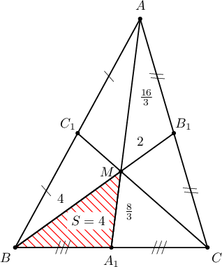 Бодолт: 6 см, 8 см медиануудаар $4$, $\dfrac83$ талтай нэг жижиг гурвалжин үүсэх бөгөөд талбай нь $\dfrac{24}{6}=4$ см.кв байна.