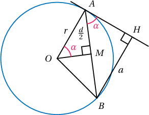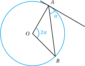 Заавар: Төв өнцгийг $2\alpha$ гэвэл хөвч ба хөвчийн үзүүрт татсан шүргэгчийн хооронд үүсэх өнцөг нь $\alpha$ байна.