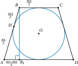 Бодолт: Суурийн уртуудыг $mx$, $nx$ гэвэл оройгоос шүргэлтийн цэгүүд хүртэлх зай $\dfrac{mx}{2}$, $\dfrac{nx}{2}$ тул хажуу талын урт нь $\dfrac{(m+n)x}{2}$ байна.