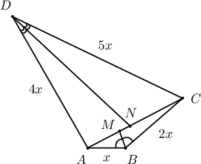 $ABC$ гурвалжны $BM$ биссектриссийн хувьд биссектриссийн чанар бичвэл $$\dfrac{x}{AM}=\dfrac{2x}{MC}\Leftrightarrow AM=t, MC=2t$$ ба $AM+MC=t+2t=3t=9$ тул $t=3$ буюу $AM=3$, $MC=6$ байна. Яг адилханаар $ADC$ гурвалжны $DN$ биссектриссийн хувьд биссектриссийн чанар бичвэл $$\dfrac{4x}{AN}=\dfrac{5x}{NC}\Leftrightarrow AN=4s, NC=5s$$ ба $AN+NC=4s+5s=9s=9$ тул $s=1$ буюу $AN=4$, $NC=5$ байна. Түүнчлэн $MN=9-3-5=1$ тул 3 см, 1 см, 5 см урттай хэсгүүдэд хуваана.