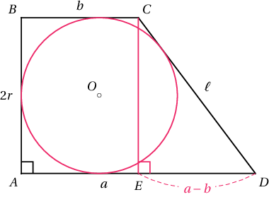 Бодолт: Багтсан тойргийн радиусыг $r$, гэвэл трапецийн өндөр буюу нэг хажуу тал нь $2r$ байна. Иймд тойрог багтаасан дөрвөн өнцөгтийн чанар ёсоор нөгөө хажуу тал нь $$\ell=a+b-2r$$