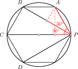Зөв 6 өнцөгтийн нэг оройгоос гарсан дараалсан 2 диагоналийн (тал байж болно) хооронд үүсэх өнцөг $30^\circ$ (тулсан нумын хагастай тэнцүү) байна.