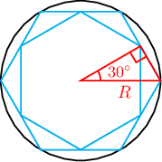 Бодолт: Зөв зургаан өнцөгт тул талын урт нь төвөөс орой хүртэлх зайтай тэнцүү. Тул $$R\cos30^\circ=\dfrac{\sqrt3}{2}R$$ байна.