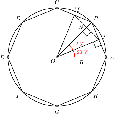 $OL=OA\cos22.5^\circ$, $NL=OL\sin22.5^\circ$ тул