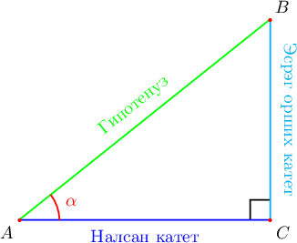$$\cos\alpha=\dfrac{\color{blue}{\text{Налсан катет}}}{\color{green}{\text{Гипотенуз}}},\ \sin\alpha=\dfrac{\color{cyan}{\text{Эсрэг орших катет}}}{\color{green}{\text{Гипотенуз}}}$$