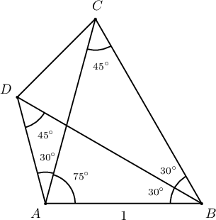 $ABCD$ дөрвөн өнцөгтөд $AB=1$, $\measuredangle ABC=60^{\circ}$, $\measuredangle ACB=45^{\circ}$, $\measuredangle BAD=105^{\circ}$, $\measuredangle ADB=45^{\circ}$ байв. $AC$ диагоналийн урт $\dfrac{\sqrt{\fbox{a}}}{\fbox{b}}$, $\measuredangle ABD=\fbox{cd}^\circ$, $AD=\dfrac{\sqrt{\fbox{e}}}{\fbox{f}}$, $CD=\dfrac{\sqrt{\fbox{g}}}{\fbox{h}}$ болно.