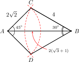 $2(\sqrt{3}+1)$ см урттай $AB$ хэрчмийн $A$ цэгт төвтэй $2\sqrt{2}$ см радиустай тойрог ба $B$ цэгт төвтэй $4$ см радиустай тойргууд $C$, $D$ цэгт огтлолцдог гэе. $\measuredangle CAD =\fbox{ab}^{\circ}$ ба $\measuredangle CBD =\dfrac{\pi}{\fbox{c}}$, дугуйнуудын ерөнхий хэсгийн талбай нь $\dfrac{\fbox{de}}{3}\pi-(4+4\sqrt{3})$ см$^2$ байна.