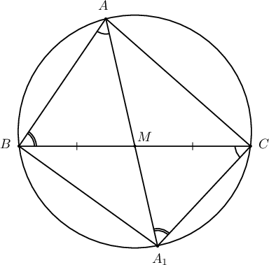 Нэг нумд тулсан өнцгүүд тул $\angle BAA_1=\angle BCA_1$, $\angle ABC=\angle AA_1C$ байна. Иймд $\triangle ABM\sim\triangle CA_1M$ тул