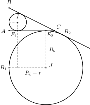 $AB=1$, $AC=2$ катетууд бүхий тэгш өнцөгт гурвалжинд багтсан тойргийн радиусыг $r$, $AC$ талыг шүргэн гадуур багтсан тойргийн радиусыг $R_{b}$ гэвэл $r=\dfrac{\fbox{a}-\sqrt{\fbox{b}}}{2}$, $R_{b}=\dfrac{\sqrt{\fbox{c}}+1}{\fbox{d}}$ байна. Энэ хоёр тойргийн $BC$ талыг шүргэх цэгүүдийг $E_1$, $E_2$ гэвэл $E_1E_2=\sqrt{\fbox{e}}-\fbox{f}$ болно.