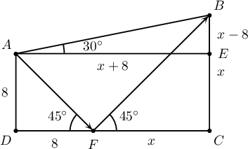 Заавар: Шонгийн өндрийг $x$ гэвэл ажиглах цэгээс шон хүртэлх зай нь $8+x$ ба шон ажиглах цэгээс $8-x$ м-ээр өндөр байна.