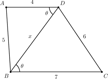 \cos\theta=\dfrac{7^2+x^2-6^2}{2\cdot 7\cdot x}=\dfrac{4^2+x^2-5^2}{2\cdot 4\cdot x}