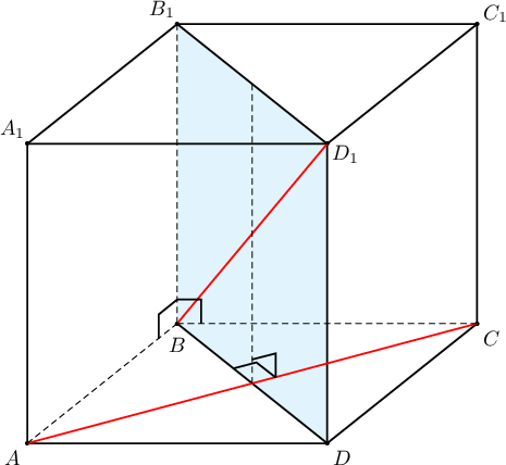 Бодолт: Квадратын диагоналиуд тул $AC\perp BD$ бөгөөд $BB_1$ нь $ABCD$ квадратын байгаа хавтгайд перпендикуляр тул $BB_1\perp AC$ байна. Иймд $AC$ нь $(BB_1D)$ хавтгайд перпендикуляр, $BD_1\in (BB_1D)$ тул $AC\perp BD_1$ буюу хоорондох өнцөг нь $90^\circ$ байна.