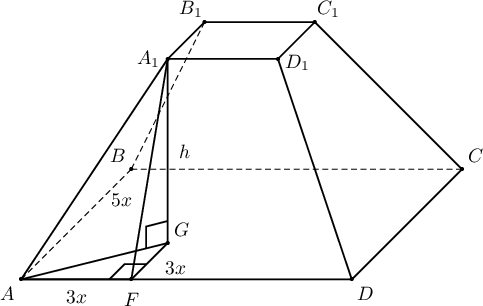 Пифагорын теоремоор $h=\sqrt{(5x)^2-(3x)^2}=4x$ тул огтлогдсон пирамидын эзлэхүүн