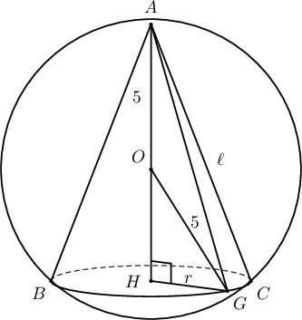Бодолт: Конусын өндрийг $h$, суурийн радиусыг $r$ гэвэл $$r^2=5^2-(h-5)^2=10h-h^2$$ ба $$\ell^2=h^2+r^2=h^2+10h-h^2=10h$$ тул хажуу гадаргуугийн талбай нь $$S(h)=\pi\sqrt{10h-h^2}\sqrt{10h}$$
