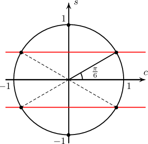 тул $\cos x=0$ эсвэл $4\sin^2x-1=0\Leftrightarrow \sin x=\pm\dfrac12$ байна. Тэгшитгэлийн шийдүүдийг тригонометрийн нэгж тойрог дээр зурж харвал: